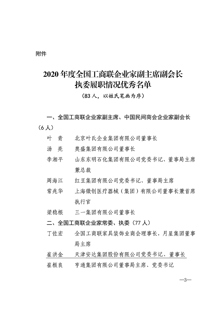 13日2021-09近日,全國工商聯(lián)發(fā)布《關(guān)于對2020年度履職情況優(yōu)秀的全國工商聯(lián)企業(yè)家副主席副會(huì )長(cháng)執委給予表?yè)P的通報》?!锻▓蟆分赋?,2020年度面對突如其來(lái)的新冠肺炎疫情沖擊影響,各位企業(yè)家副主席、副會(huì )長(cháng)、執委認真學(xué)習貫徹習近平新時(shí)代中國特色社會(huì )主義思想,以實(shí)際行動(dòng)響應中央號召,積極投身抗擊疫情狙擊戰,...[查看詳情]