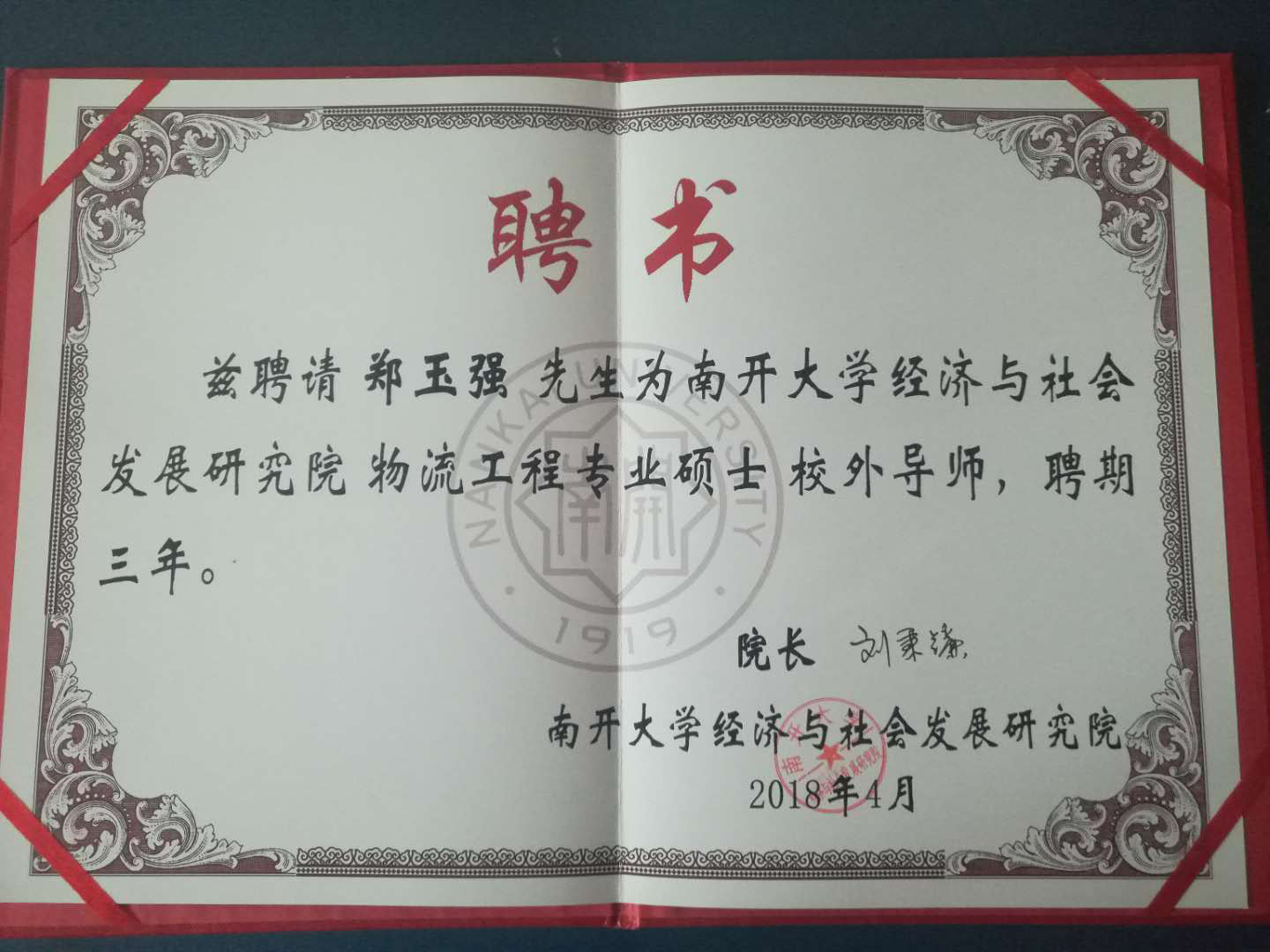 2018年4月27日,南開(kāi)大學(xué)經(jīng)濟與與社會(huì )研究院院長(cháng)劉秉廉教授向鄭玉強頒發(fā)聘書(shū),聘請鄭玉強為研究院物流工程專(zhuān)業(yè)碩士校外導師,聘期為三年。