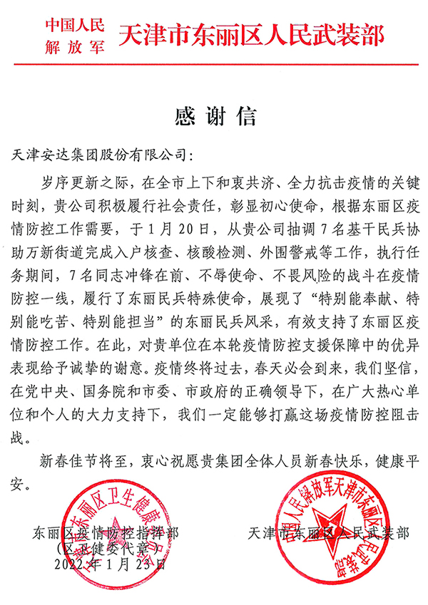 感謝東麗區疫情防控指揮部 東麗區人民武裝部隊對我集團志愿服務(wù)的肯定