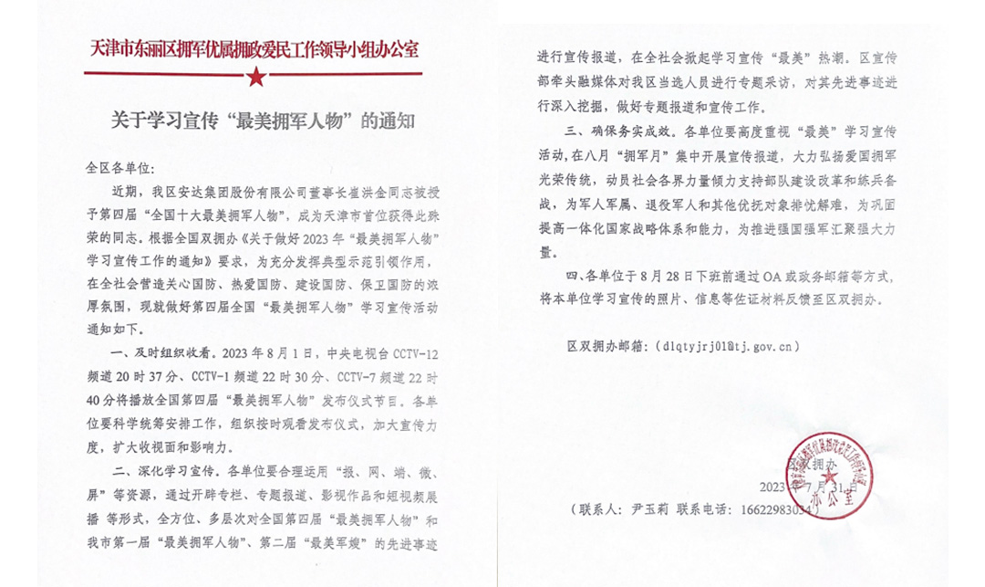 81日在建軍96周年之際及紀念延安雙擁運動(dòng)80周年,央視法治頻道播出了《閃亮的名字-2023年最美擁軍人物發(fā)布儀式》,本次活動(dòng)旨在深入學(xué)習貫徹習近平新時(shí)代中國特色社會(huì )主義思想和黨的二十大精神,深入貫徹落實(shí)習近平總書(shū)記關(guān)于雙擁工作重要論述,發(fā)揮先進(jìn)典型示范引領(lǐng)作用,在全社會(huì )營(yíng)造關(guān)心國防、熱愛(ài)國防、建設國防、保衛國防的濃厚氛圍,中共中央宣傳部、退役軍人事務(wù)部、中央軍委政治工作部、全國雙擁辦聯(lián)合發(fā)布最美擁軍人物先進(jìn)事跡。安達集團黨委書(shū)記、董事長(cháng)崔洪金獲得2023全國“最美擁軍人物”。