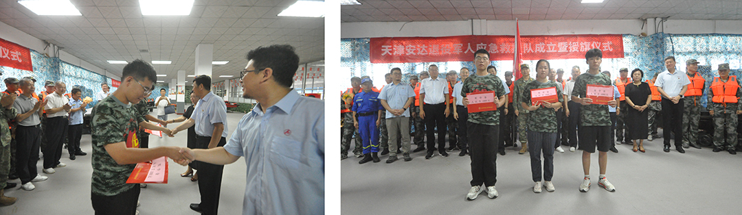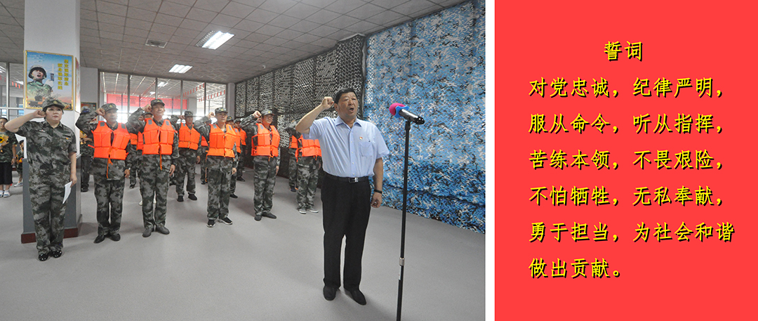 在主持人馬萍向崔洪金董事長(cháng)鏗鏘有力的請示后,活動(dòng)正式開(kāi)始。全體人員齊唱國歌,伴隨著(zhù)嘹亮的歌聲,五星紅旗冉冉升起。隨后全體人員移步二樓退役軍人之家,在全體領(lǐng)導、安達職工及職工子弟的共同見(jiàn)證下,全國“最美擁軍人物”崔洪金宣布“天津安達退役軍人應急救援隊”成立并帶領(lǐng)全體救援隊隊員宣誓。         在全體人員的共同見(jiàn)證下,區退役軍人事務(wù)局局長(cháng)曹硯海,區應急管理局黨委委員俞先軍分別向安達集團董事長(cháng)崔洪金、應急救援隊隊長(cháng)張恩欣授牌和授旗。